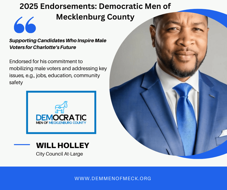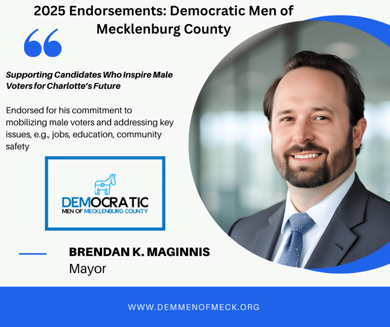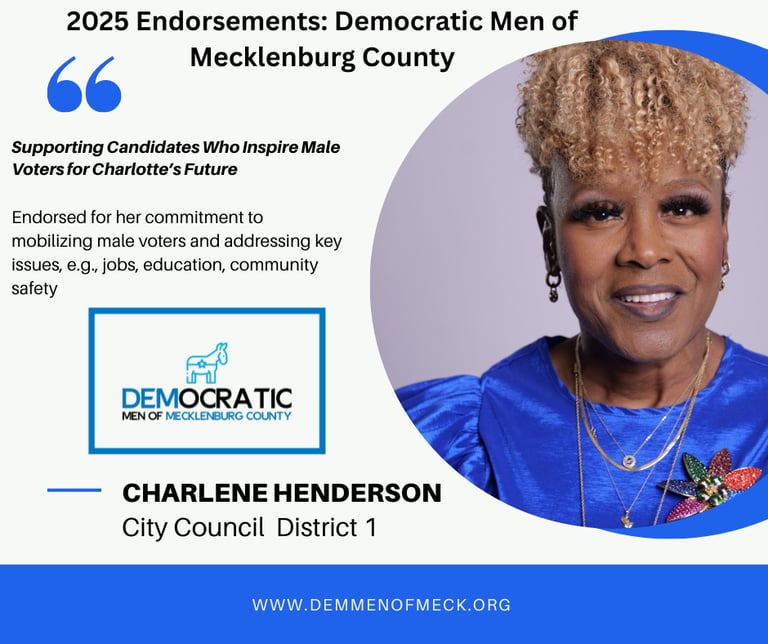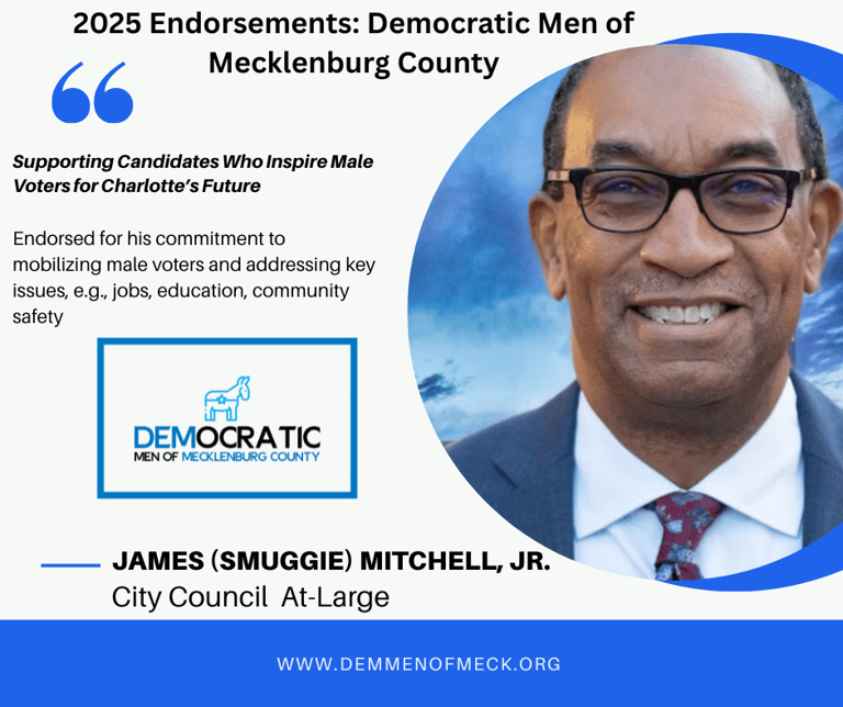 Our endorsements for Mayor and City Council primary candidates reflect their commitment to mobilizing male voters, fostering inclusive spaces, and addressing issues like jobs, education, and community safety. Following our rigorous process—questionnaire submissions and the public Final Word Forum on September 5, 2025, at Gilde Brewery—we proudly announce our endorsed candidates on September 6, 2025, to strengthen the Democratic base in Mecklenburg County.